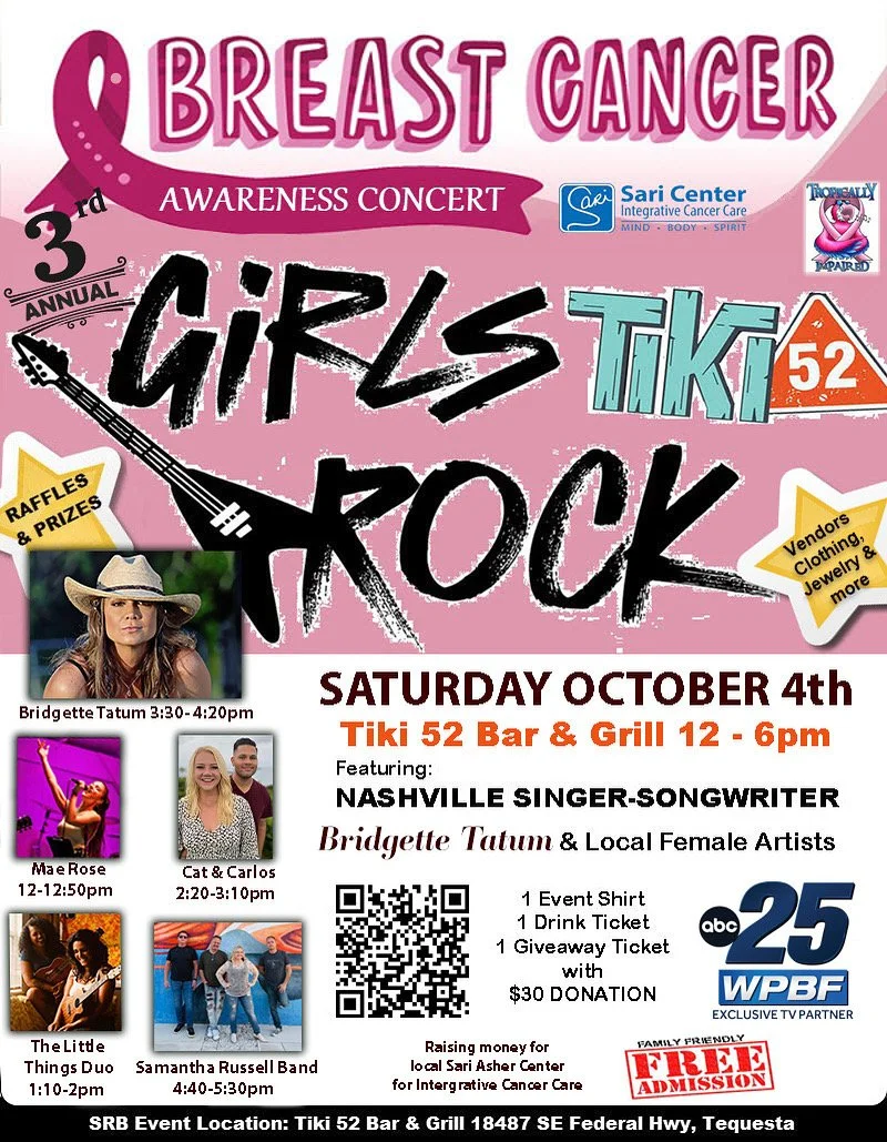 Proud to announce that SRB Entertainment, Samantha Russell Band has partnered with Tiki 52 Bar & Grill to raise money for the Sari Center, Integrative Cancer Care. Sari Center is a non-profit comprehensive cancer support center working to ensure that all patients and families have access to proven integrative therapies that can help improve symptoms, side effects, and overall quality of life.